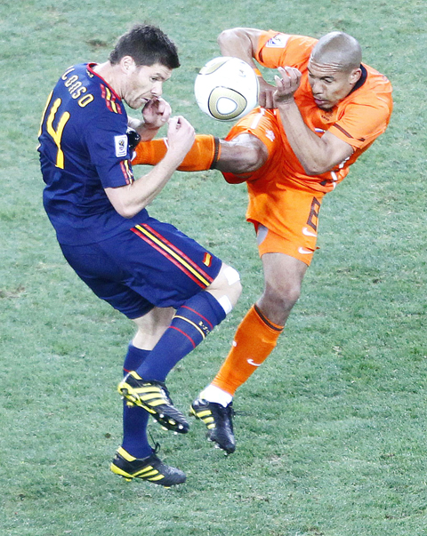 Spain’s early impetus slowed in the face of the Dutch snapping into every tackle — Nigel de Jong in particular was lucky to stay on the pitch after a reckless high challenge resulted in him planting his studs into Xabi Alonso’s chest — but they reasserted themselves after the interval, with Joan Capdevila and then Villa both squandering great chances.