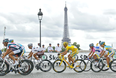 Contador sipped champagne during the leisurely ride and held up three fingers to signal his third Tour win. His Astana team was prepared to quash any attempt for Schleck to break away on Sunday — and they had a playful ride.