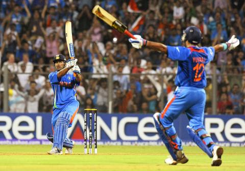 India, cheered by a sell-out crowd of 33,000 at the Wankhede stadium, surpassed the challenging target with 10 balls to spare as Dhoni pounded Nuwan Kulasekara for the winning six.