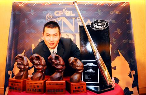 Lin Hong-yu came away as the biggest winner at the Chinese Professional Baseball League’s (CPBL) annual awards ceremony in Taipei on Sunday with five trophies and NT$330,000 (US$11,045) in prize money under his belt, including the coveted Most Valuable Player honor.