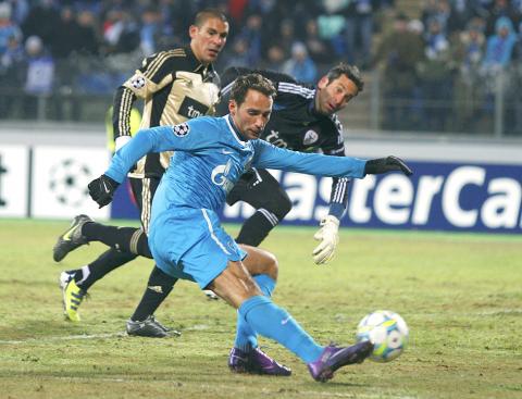The visitors struck first, Uruguayan defender Pereira slotting home from close range in the 20th minute when Zenit goalkeeper Yuri Zhevnov, playing in his first Champions League game, could not hold on to the ball following a free-kick by Cardozo.
