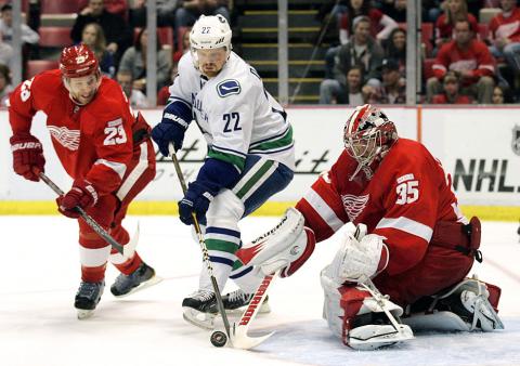 A sold-out crowd stood during the shootout, which started with Canucks goalie Roberto Luongo stopping Jiri Hudler’s shot. Detroit’s Jimmy Howard then went low to smother David Booth’s attempt.