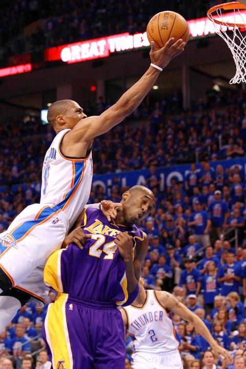 Russell Westbrook scored 28 points and Kevin Durant had 25 for the Thunder, who took a playoff series from the Lakers for the first time since 1979.