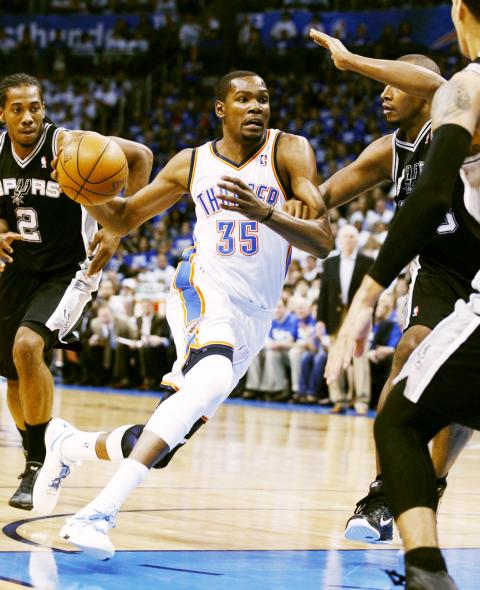 Kevin Durant scored half of his 36 points in the fourth quarter on Saturday as the Oklahoma City Thunder beat the San Antonio Spurs 109-103 to tie the NBA Western Conference Finals at two games apiece.