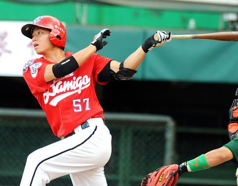 The Lamigo Monkeys’ Lin Chih-sheng hit an RBI single off his Monkeys teammate Hsu Ming-jeh to cap a three-run seventh that broke a 6-6 tie as Team White held on to defeat Bank of Taiwan Team Red 9-8 at the Sinjhuang Baseball Stadium in New Taipei City last night in this year’s All-Star Game.