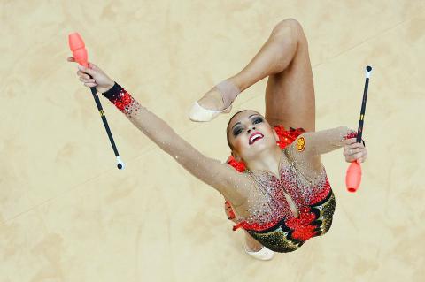 The gymnasts perform floor routines accompanied by music with four pieces of apparatus — a hoop, a ball, a set of clubs and a ribbon — and they are awarded a score by three juries.