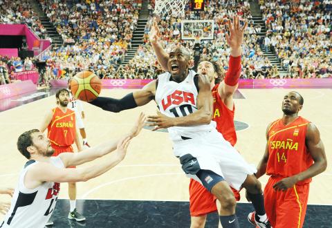 After Spain’s Juan-Carlos Navarro sank a jumper and Rudy Fernandez tapped in a follow shot on a fast break, James took the spotlight with a drive he finished with a volatile slam and a three-pointer that restored the US’ cushion.