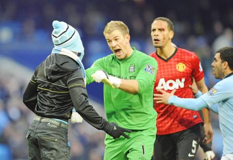 City goalkeeper Joe Hart had to restrain one fan from getting at Ferdinand after the coin-throwing incident, prompting the United defender to thank his one-time England colleague on Twitter.