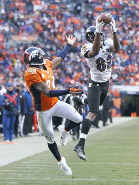 On third-and-three from his 30-yard line with 41 seconds and no timeouts left, Flacco bought time in the pocket and saw Jacoby Jones sprinting down the right sideline into double coverage. Defensive back Tony Carter slowed up and let Jones streak by him. Safety Rahim Moore elected not to track Jones, but rather to leap and try to knock down the ball. Flacco, who throws the high, deep ball as well as anyone, got it over Moore’s head and into Jones’ hands.