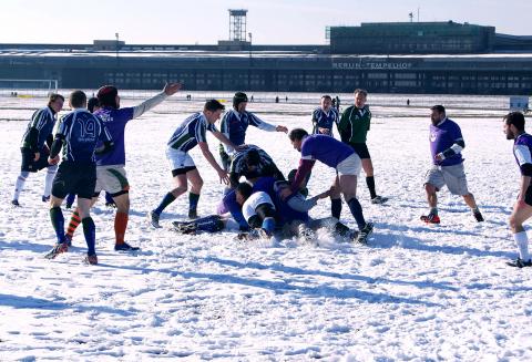 In freezing temperatures on a snow-covered public soccer pitch adapted for rugby, the Bruisers lost 45-22 to Dublin’s Emerald Warriors on the site of the historic Tempelhof airport.