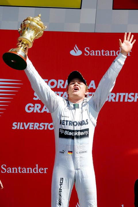 It was the Mercedes team’s first victory in Britain since Stirling Moss won at Aintree in 1955 and Rosberg’s second in three races and third of his career.