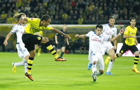 New signing Pierre-Emerick Aubameyang netted twice, as did Poland international striker Robert Lewandowski, as UEFA Champions League runners-up Dortmund pulled away after Hamburg had leveled at 2-2.