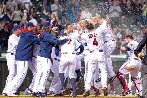 Once he discarded his bat, rounded the bases and tossed his helmet, Michael Brantley was doused with water by his celebrating teammates.