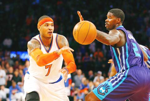 On a night when he joined the NBA’s 20,000-point club, Carmelo Anthony scored 28 points, including the go-ahead basket with 1 minute, 23 seconds remaining, as the New York Knicks narrowly defeated the Charlotte Hornets 96-93.