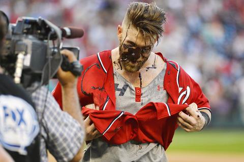 Harper homered three times against Miami on Wednesday and connected twice against Atlanta on Friday. Max Scherzer demonstrated the team’s newest victory celebration — he poured chocolate sauce over Harper during a post-game interview.