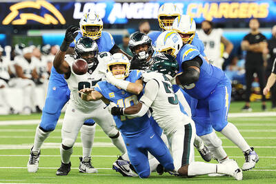 Tony Jefferson intercepted a Jalen Hurts pass in overtime to give the Los Angeles Chargers a 22-19 victory over the Philadelphia Eagles on Monday in an NFL thriller between playoff contenders. Justin Herbert, playing a week after surgery on his broken left (non-throwing) hand, withstood a career-high seven sacks to throw for 139 yards and a touchdown for the Chargers. Cameron Dicker kicked five field goals, including the 54-yard game winner in overtime. The Chargers defenders forced Hurts to throw four interceptions and surrender a fumble for a career-worst five turnovers as the Eagles fell to 8-5 with a third