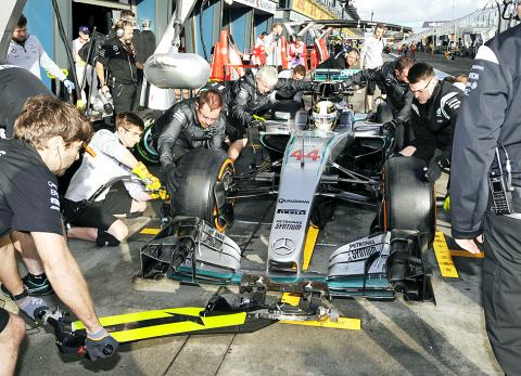 World champion Lewis Hamilton topped the timesheets for Mercedes in both practice sessions of the Australian Grand Prix yesterday, but the wet conditions put a dampener on Formula One’s season opener.