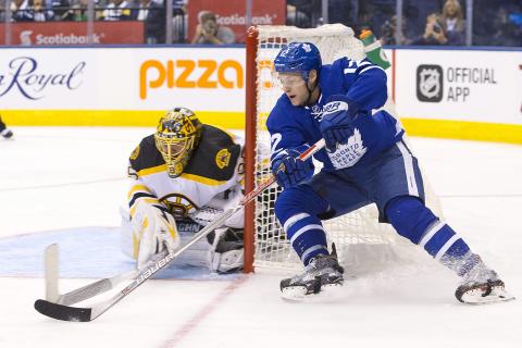 The fourth overall pick in last year’s draft, Marner took a pass from Tyler Bozak just outside the Boston blue line, gained the offensive zone with space and fired a shot far-side past goaltender Anton Khudobin.