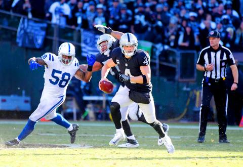 Raiders quarterback Derek Carr, who threw three touchdown passes, left the game in the fourth quarter after breaking his right fibula on a sack by Colts linebacker Trent Cole.