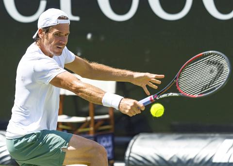 The 39-year-old Haas, playing for the last time at the grass-court tournament, defeated Pierre-Hugues Herbert 6-3, 4-6, 7-5 in their first-round match.
