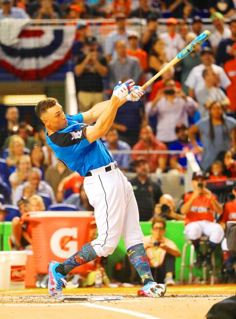 Judge, 200.7m and 128kg, sprayed balls off the glass behind left field that supports the Marlins Park retractable roof, hit one over the Red Grooms home run sculpture in left-center, over the batter’s eye in straightaway center and, unusual for a derby, several to the opposite field, too.
