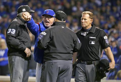 Maddon became incensed that a swinging strike three against Curtis Granderson was ruled a foul after the umpires discussed the play.