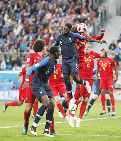 From Griezmann’s corner, Umtiti beat Marouane Fellaini at the near post and powered a header home to put France ahead.