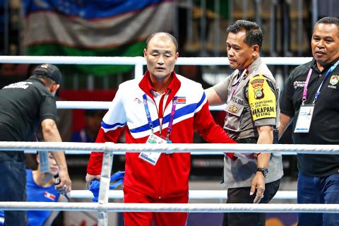 Coach Pak Chol-jun refused to leave the ring and incited boxer Pang Chol-mi to remain behind in protest against the judging after China’s Chang Yuan won gold on a 3-2 split decision.