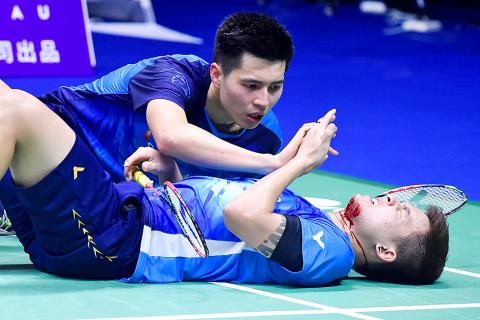 The 26-year-old lay prone on the court floor for nearly 10 minutes with a gashed chin, blood pouring down his neck, with the men’s doubles clash against top seeds Japan locked at 19-19 in the deciding game.