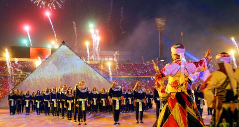 Egyptian President Abdel-Fattah al-Sisi attended the game and gave a speech before an opening ceremony, which centered on replica pyramids standing on the field that were lit up by laser lights as fireworks went off around them.