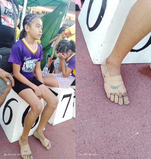 Bullos, 11, was one of several on her team of 12 athletes who made their own footwear, because they had only two pairs of running shoes among them at the competition in the central province of Iloilo.