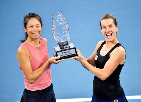 Taiwan’s Hsieh Su-wei and Barbora Strycova yesterday battled back from a set down and saved a championship point to claim their first doubles title of season at the Brisbane International.