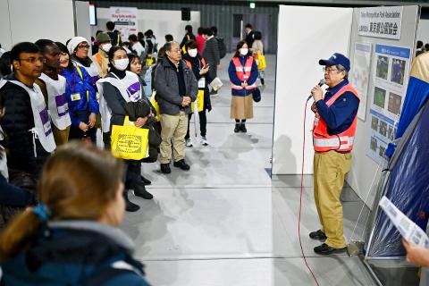 More than 200 of Tokyo’s about 570,000 foreign residents yesterday gathered at Musashino Forest Sports Plaza, which is to stage events during the Games, to run through drills aimed at making them more disaster-savvy.