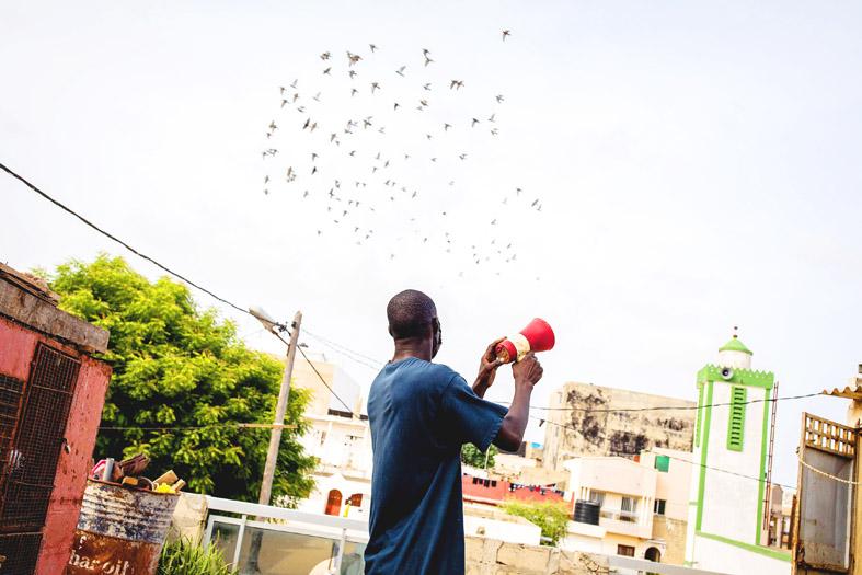 From his roof in a suburb of the capital Dakar, 40-year-old shopkeeper Moustapha Gueye releases scores of pigeons from their acrid-smelling loft.