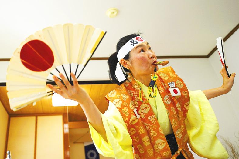She wears a traditional Japanese costume for festivals and a headband printed with “Victory” written in Japanese. In her hands she holds folding fans emblazoned with the Japanese flag.