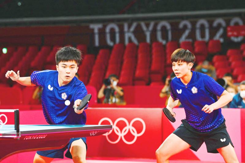 Taiwanese table tennis mixed doubles pairing Lin Yun-ju and Cheng I-ching yesterday breezed past their French opponents to clinch a bronze medal at the Tokyo Games, the nation’s first Olympic table tennis medal in 21 years.