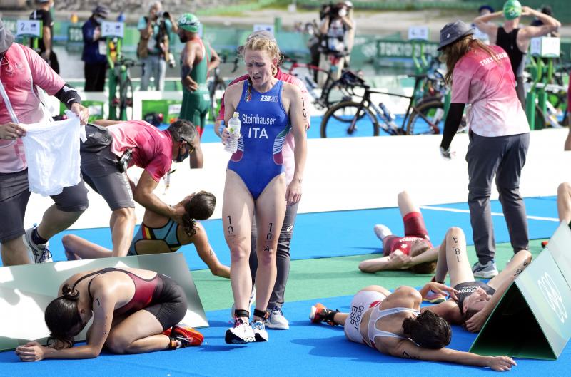 It was carnage in the transition area after the first handover, with half the exhausted first-leg women scattered over the blue carpet and medical staff hauling them to their feet and dragging them clear as the heat took its toll.
