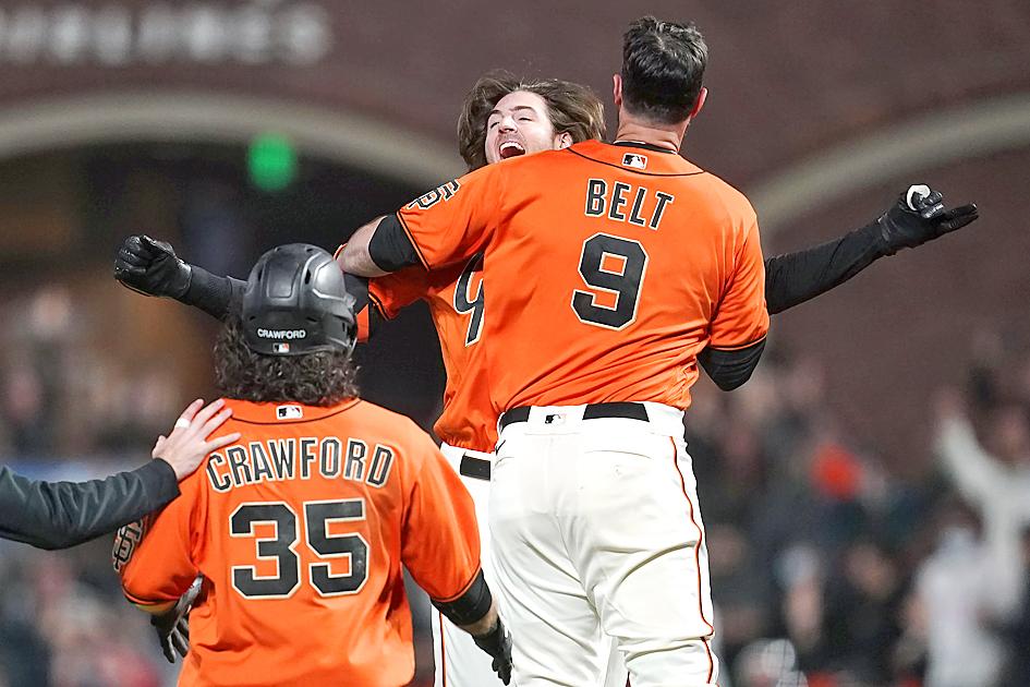 Brandon Belt hit a two-run homer, Crawford also connected and LaMonte Wade Jr had a splash homer — recorded when Giants players hit a home run that lands in McCovey Cove on the fly — for the Giants.
