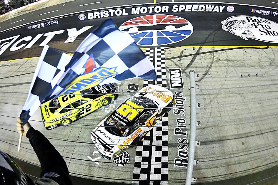 A.J. Allmendinger slid sideways across the Bristol Motor Speedway finish line to edge rival Austin Cindric for the win on Friday and the NASCAR Xfinity Series regular-season championship.