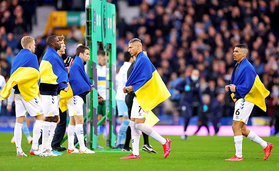 The teams sported the colors of the Ukraine flag before the match, with Zinchenko in tears as the crowd unveiled banners including one that read: “We stand with Ukraine.”