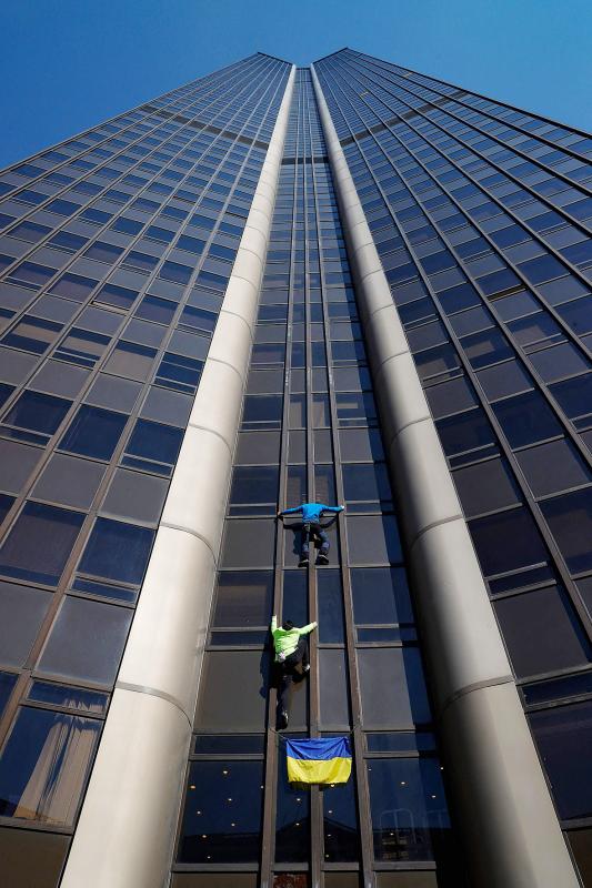 Two young French urban climbers on Monday scaled the tallest building in Paris with no ropes or specialist equipment in an act of solidarity with Ukraine in the face of the Russian invasion.