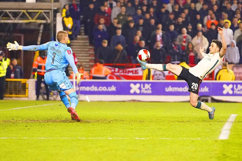 Three minutes later, Jota showed the Forest forwards how it is done as he stretched to meet Kostak Tsimikas’ cross for his 19th goal of the season.
