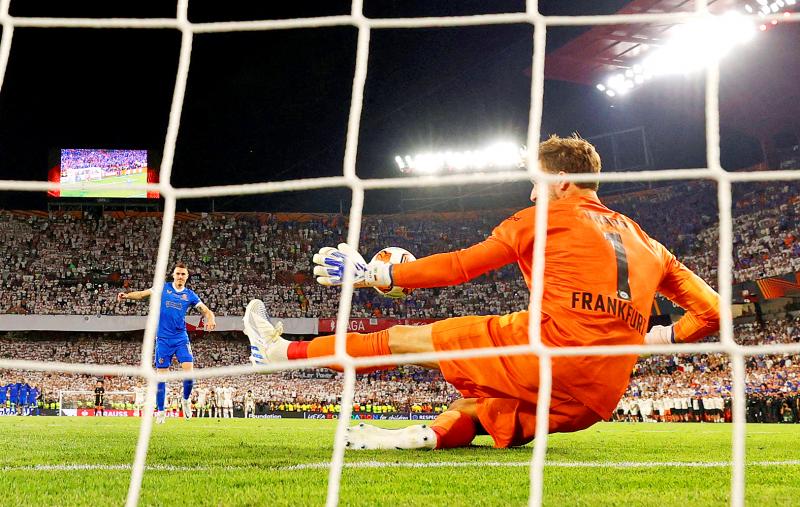 The veteran goalkeeper used his left leg to stop Aaron Ramsey’s penalty in the shoot-out, setting off huge celebrations by Frankfurt’s “white wall” of fans behind the opposite goal.