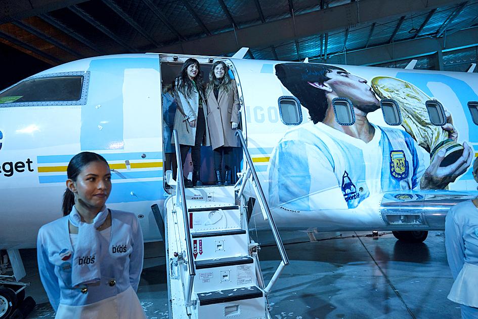 It features a picture of Maradona kissing the World Cup trophy on the fuselage, while his face is also on the tail.