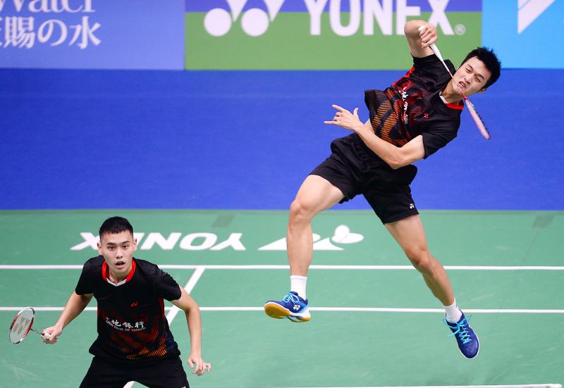 Tawan’s Po Li-wei, left, watches as Chang Ko-chi returns during one of their men’s doubles Yonex Taipei Open matches yesterday. It was the first day of the event, which saw the duo beat Taiwan’s Lin Bing-wei and Yu Sheng-po 13-21, 21-17, 21-16. However, they lost 21-18, 21-23, 21-19 to Hong Kong’s Law Cheuk-him and Yeung Nga-ting.