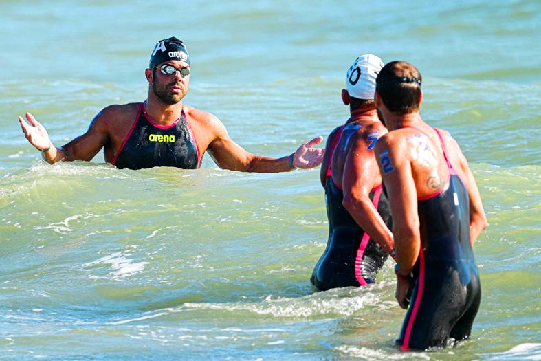 After more than three-and-a-half hours of swimming, with the men having swum 15km, and Paltrinieri and Acerenza again one and two, the races were halted. Italians Barbara Pozzobon and Veronica Santoni had been at the front of the women’s race.
