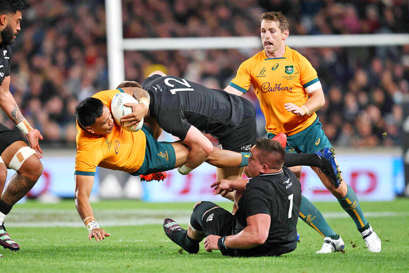 Australia were first reduced to 14 men after two minutes when lock Jed Holloway was shown a yellow card for a lifting cleanout on All Blacks flanker Dalton Papali’i.