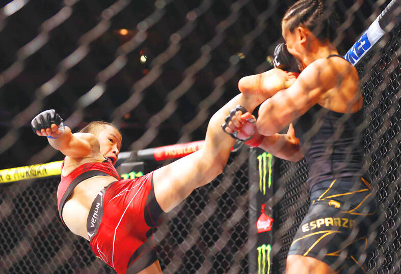 Zhang Weili won the 115-pound title belt for a second time and UFC’s first Chinese champion made quick work against Carla Esparza with a rear naked choke submission at 1:05 of the second round.