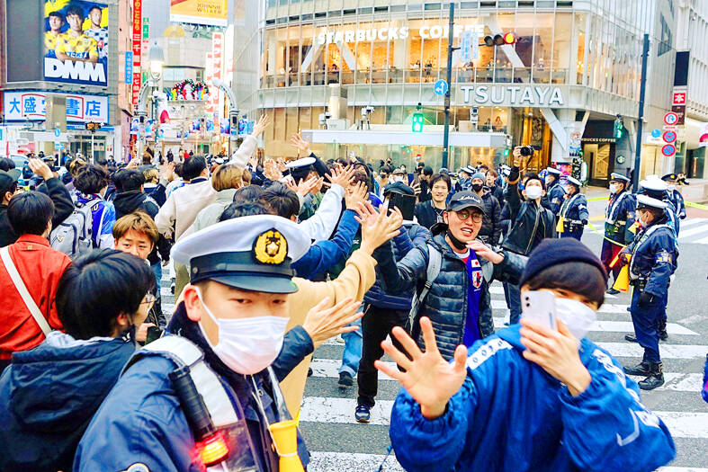 Fans lingering in Shibuya pressed high-fives on bleary commuters making their way to work from one of Tokyo’s busiest stations.