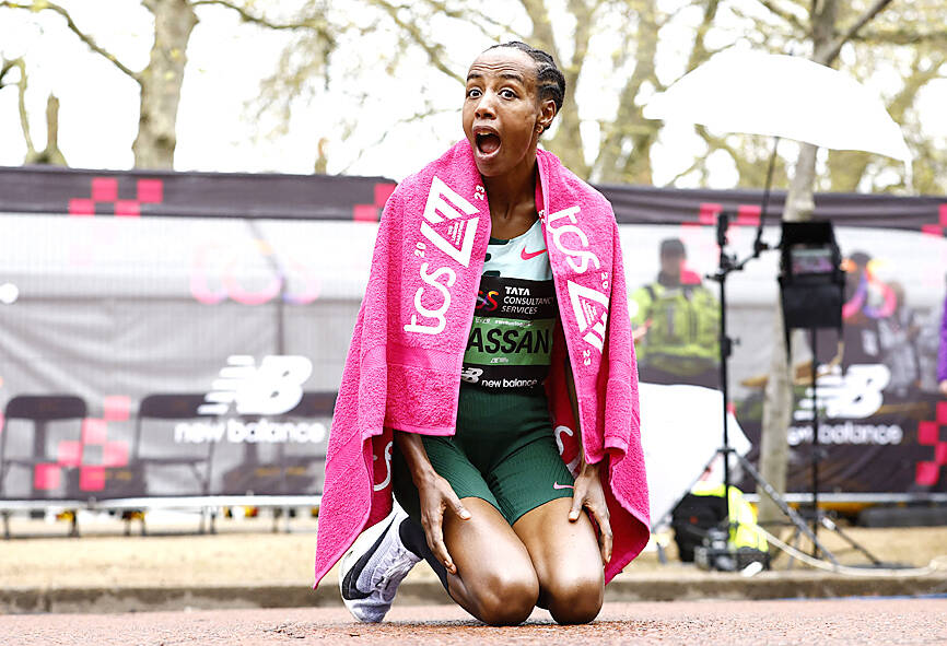 It would have been impressive enough had the Ethiopian-born Dutch runner — a Muslim who had been fasting due to Ramadan — simply completed the course on the rainswept streets of the British capital, as she then grabbed her hip and stopped to stretch off the injury.